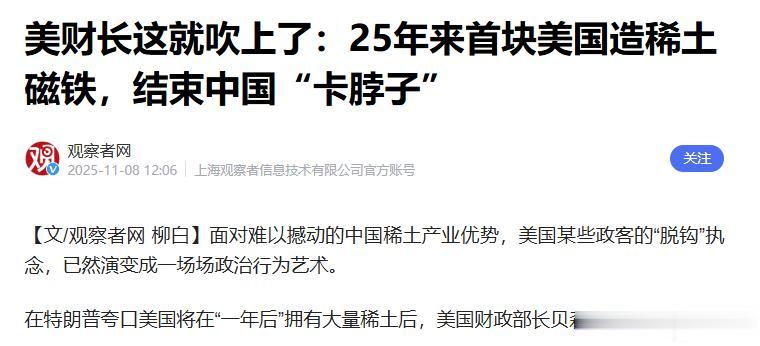 中方刚放宽稀土出口的限制,美国财长贝森特就出来喊话说,不怕中方在稀土上 “卡脖子”,但这事儿真像他说的那么靠谱吗?