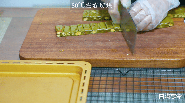 6.糖温度稍凉有点烫手就可以切,温度过低切时容易碎渣,如过凉就放烤箱回温一下,或用热吹风机吹下。