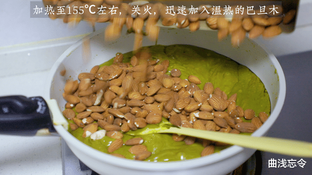 5、加巴旦木:后期熬制时要随时观察颜色和测量温度,温度在155℃左右时(如无温度计,可随时滴一点糖液在冷水中,冷却后变得酥脆即可),关火,马上倒入温热的巴旦木,快速翻拌均匀。