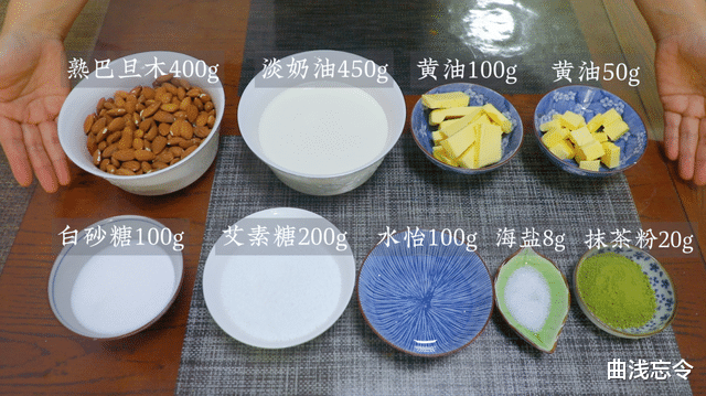 食材:熟巴旦木400g、淡奶油450g、白砂糖100g、水怡100g、艾素糖200g、海盐8g、黄油100g+50g、抹茶粉20g