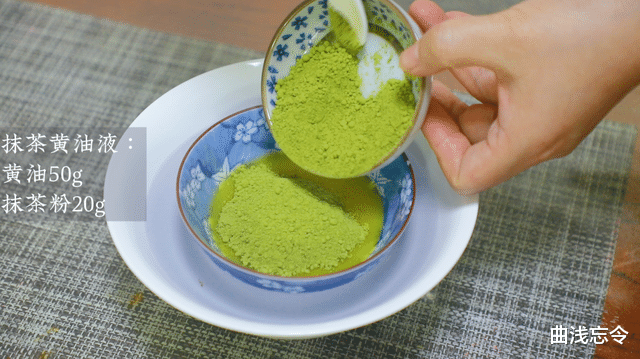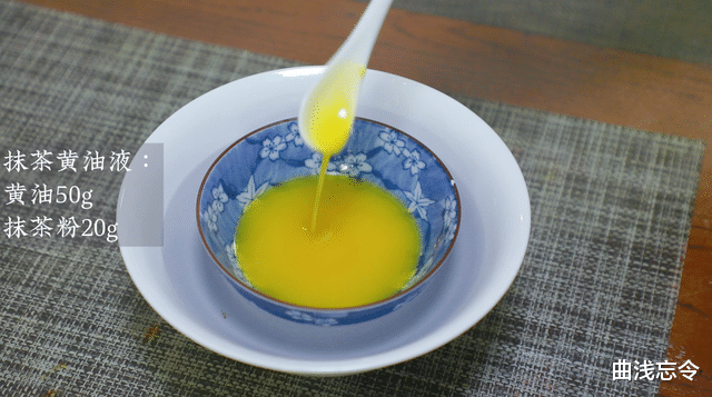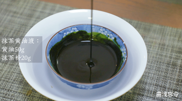 2、融化抹茶粉:黄油50g隔水融化成黄油液,加入抹茶粉20g,搅拌使其完全融化。继续隔温水温热保温。(因为抹茶粉更适合用油来融化,所以先分了一部分黄油来融化抹茶粉,而熬制时如少了黄油容易黏锅,所有还是要留一部分黄油与其他食材一起熬制。)