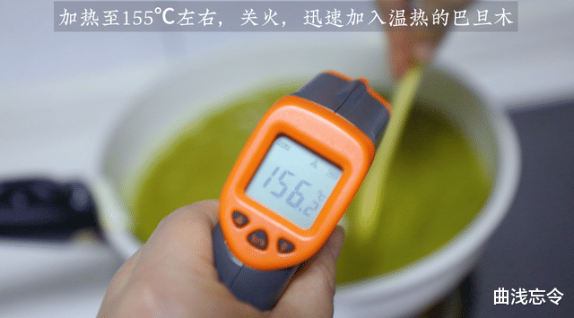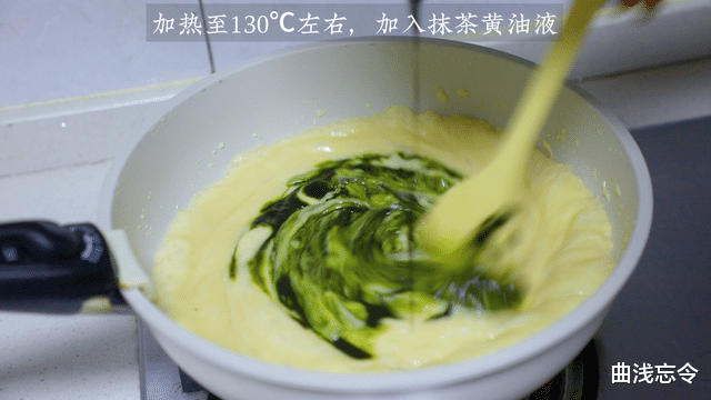 4、加抹茶黄油液:温度在130℃左右时加入抹茶黄油液,同时要不停搅拌,使其与糖浆快速融合。抹茶后加可避免过早添加而导致颜色变得太黄太深。