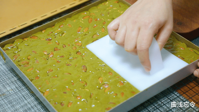 5.熬好的糖浆非常烫,倒入烤盘时借助刮刀,不建议用手去接触,如用手必须带不粘手套,避免烫伤。
