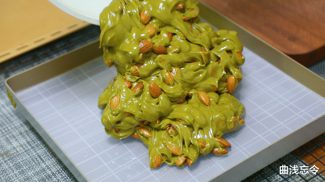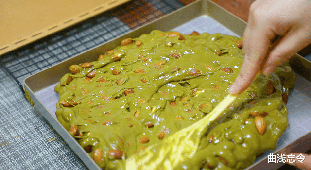 1、烤巴旦木:熟巴旦木100℃烤10分钟继续100℃保温。生的先150度烤10分钟烤熟,转100℃继续保温,确保巴旦木一直处于温热状态。同时把要用的烤盘、不粘垫、压平器也放入烤箱内或烤箱顶保持同样温度,确保太妃糖整型时所接触的器具都在同一温度,避免因温差出油。