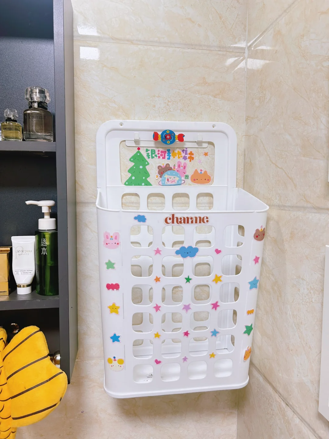 将家里的壁挂垃圾桶粘贴在浴室或者是洗衣机旁边,这样洗完澡之后就可以将换下来的脏衣服直接放进去,当做一个脏衣篓来使用了。