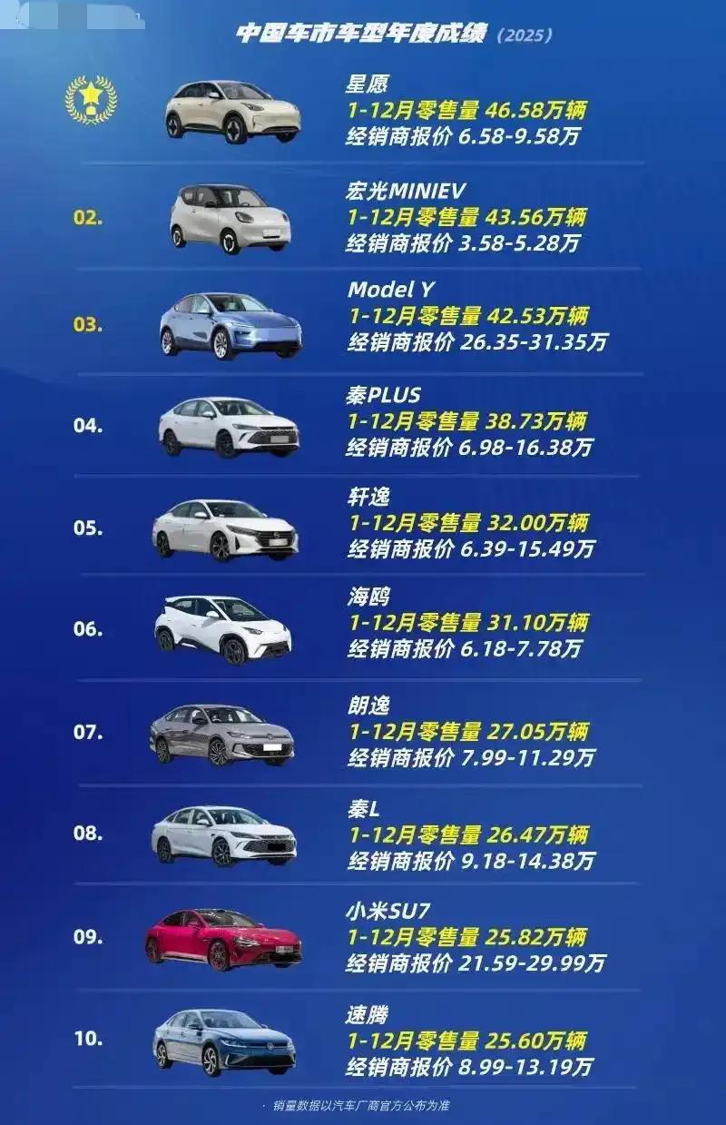 2025年,中国单一车型销量冠军——吉利星愿,全年销量465,775辆。