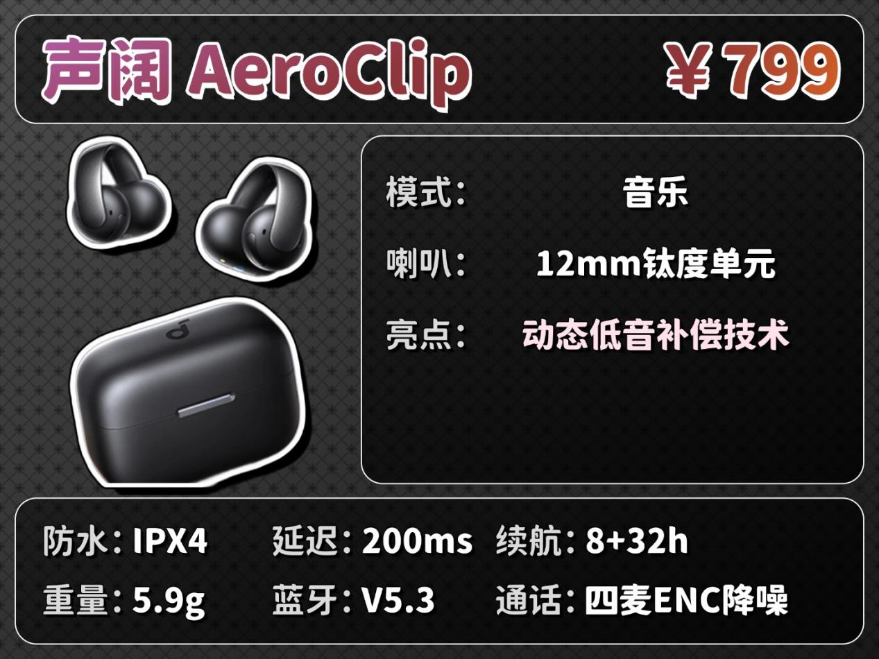 声阔 AeroClip在音质上采用12mm钛度单元,确保了声音的通透与扎实感;还配备了动态低音补偿技术,能根据播放内容实时增强低频,有效弥补了耳夹式耳机常见的低音不足问题,让鼓点饱满、人声突出,达到均衡且有弹性的听感。佩戴上采用延长C形桥与SoftFit锁定系统,能非常牢固地挂在耳朵上,运动时也不易松动,但耳夹部分偏硬,长时间使用舒适度比较一般。性能上具备四麦克风通话降噪,实际打电话时人声很突出,续航能满足一天以上的使用。虽然它戴久了舒适性一般,但稳固的佩戴和清晰的通话效果很可靠。适合对音质表现有较高要求的用户。