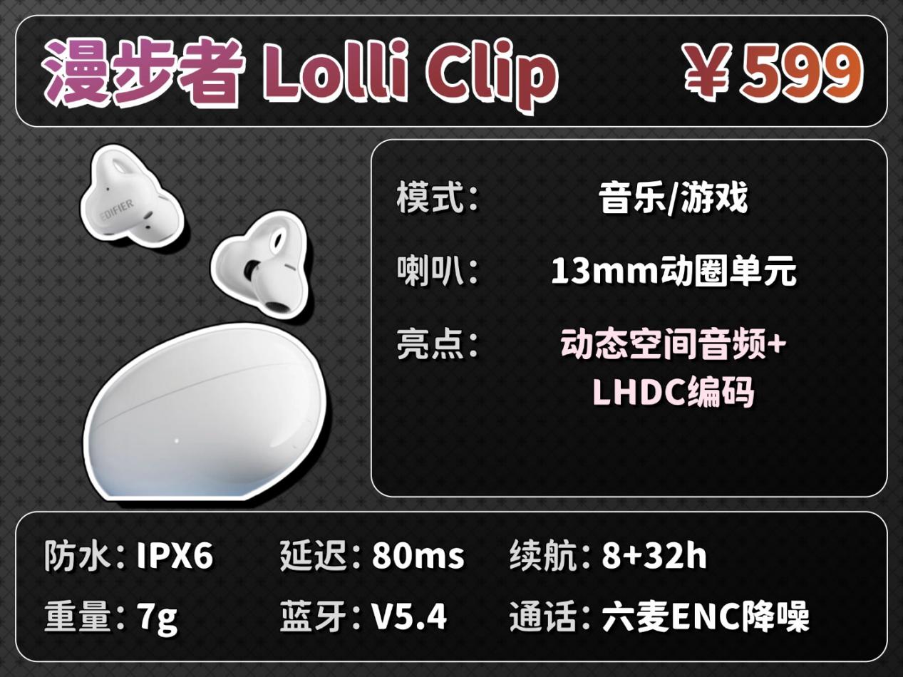 漫步者Lolli Clip在音质上搭载13mm动圈单元,为声音提供了扎实饱满的基底;动态空间音频技术能营造出开阔且有层次的声场,显著增强了听歌观影的沉浸感与环绕效果;同时支持LHDC高清编码,确保了更多音乐细节的传输。佩戴上采用C形桥结合多曲度软梁设计,能比较贴合耳廓,戴起来稳固性不错,但单耳7克的重量确实有点分量,时间长了耳朵会有点负担。性能方面它具备IPX6高级别防水,出汗下雨都不用担心,六麦克风通话降噪效果很好,人声清晰。虽然耳机偏重且存在漏音,但它的音质表现和防水能力很扎实,适合经常在户外或运动场景使用、需要可靠防护和通话质量的用户。