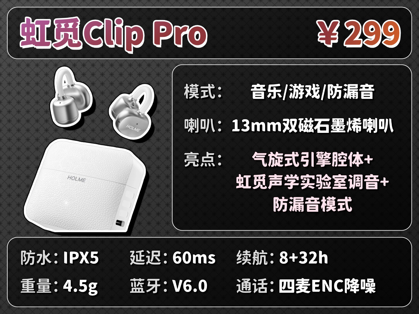 它有着13mm双磁石墨烯喇叭,有两个高精度磁铁的设计,加强磁场,带来更大的声音。再加上气旋式引擎腔体,用铝合金的材质,把小圆头改成了圆柱形的结构,这种金属腔体能推动更多气流,让低频的效果更强。同时它石墨烯材质的振膜有很强的形变能力,能确保声音细节得到充分保留,不易失真。最后经过虹觅声学实验室专业调校,不对声音过度修饰;声音十分耐听,整体音质足以媲美500元价位的耳夹耳机。佩戴上采用2.5mm错位设计契合耳廓曲线,确保佩戴的稳固性,还有∠12°弧面耳托紧贴耳背,能有效分散压力,还有4.5g的超轻机身,长时间佩戴依然保持舒适状态。性能上支持防漏音模式,在安静环境使用更安心;具备智能一拖二连接,切换设备方便;还有四麦降噪保证通话清晰,非常适合对各方面体验都有要求的用户选择。