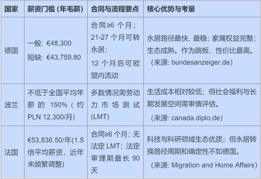 蓝卡的申请路径本身并不复杂,关键在于能否快速完成准备。如果你具备符合条件的学历、雇主合同与薪资水平,通过德国蓝卡通道登陆欧洲,是当下最稳、最快的路径之一。多数申请人从签约到拿到蓝卡,仅需2–3个月。对比法国审理期与波兰的劳动力测试,德国的确性价比更高。