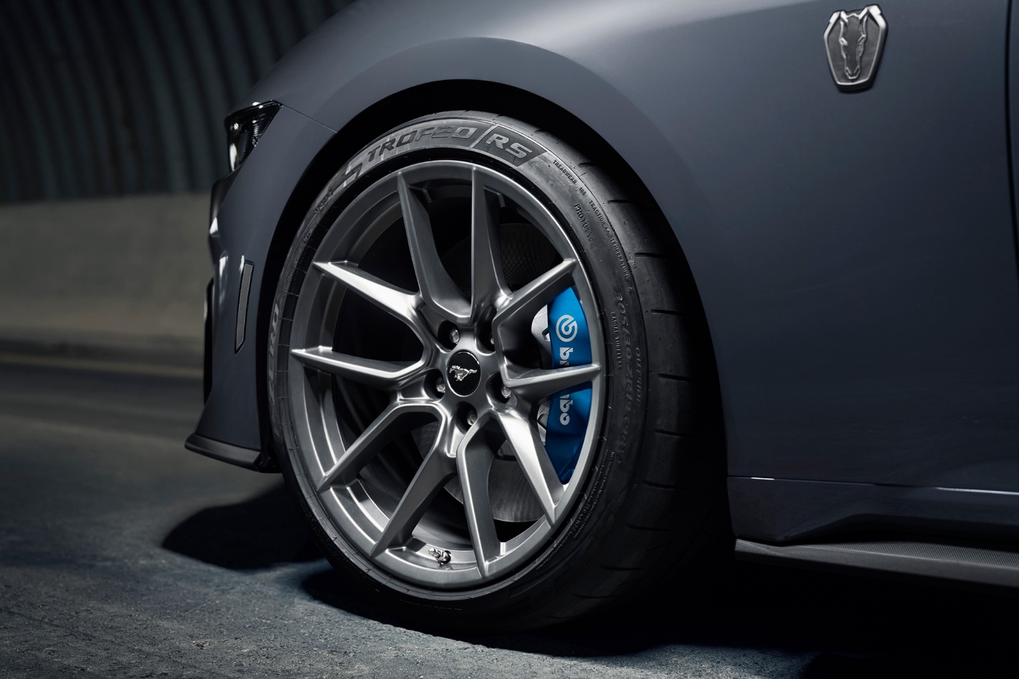支撑高性能表现的另一方面在于全新福特Mustang Dark Horse在底盘设计与调校上展现的执著追求。相比普通版本车型,全新福特Mustang Dark Horse配备了更为粗壮的后防倾杆和前减震器。19英寸轮毂容纳了Brembo™前6活塞、后4活塞制动卡钳与高性能制动盘。全新设计的轻量化发动机舱塔顶平衡拉杆与发动机舱底部的K-Brace平衡杆,出品自福特高性能团队(Ford Performance),增强了全新福特Mustang Dark Horse的转向响应和抓地力,也带来了更加出色的操控手感和道路反馈。Torsen®托森限滑差速器和前后混合胎宽设计的倍耐力P ZERO™ (PZ4)轮胎一起,保证了全新福特Mustang Dark Horse在不损失抓地力的同时,有效将发动机输出的澎湃扭矩传递至轮端。此外,全新福特Mustang Dark Horse标配MagneRide®主动电磁感应悬挂系统,能够实时监测车轮和轮胎每秒1000次的动态变化并根据所行路面或驾驶模式优化车辆性能,在享受赛道极致驾控的同时,兼顾了多种路况下的驾驶舒适性。