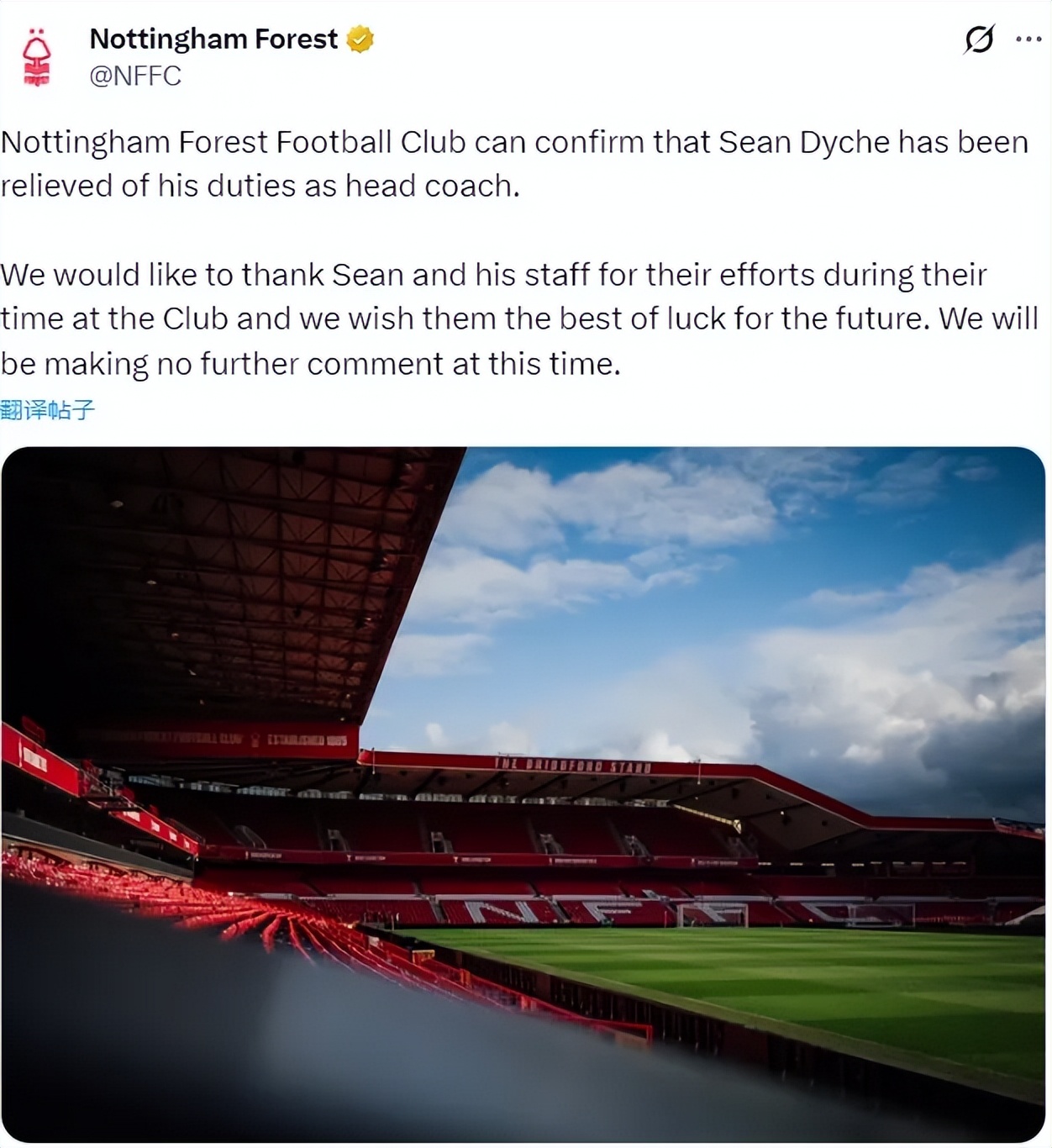 官方:诺丁汉森林宣布解雇了肖恩-戴彻,这名教练仅仅上任了4个月左右。