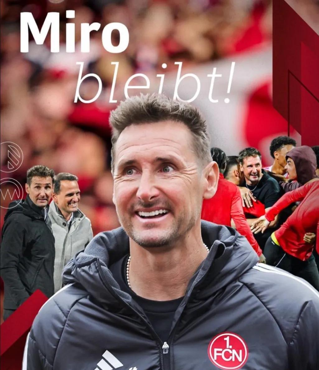 官方:纽伦堡宣布续约了米洛斯拉夫-克洛泽。