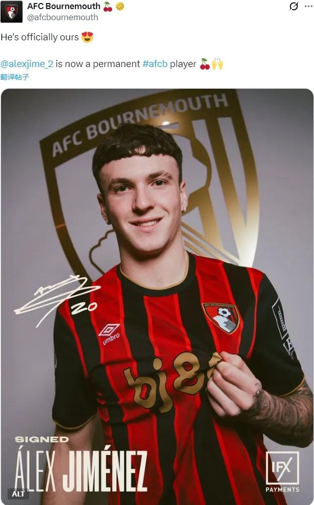 官方:伯恩茅斯宣布从米兰买断了亚历克斯-希门尼斯。