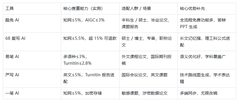 总结:5 款 AI 工具查重率 & 适配场景对比