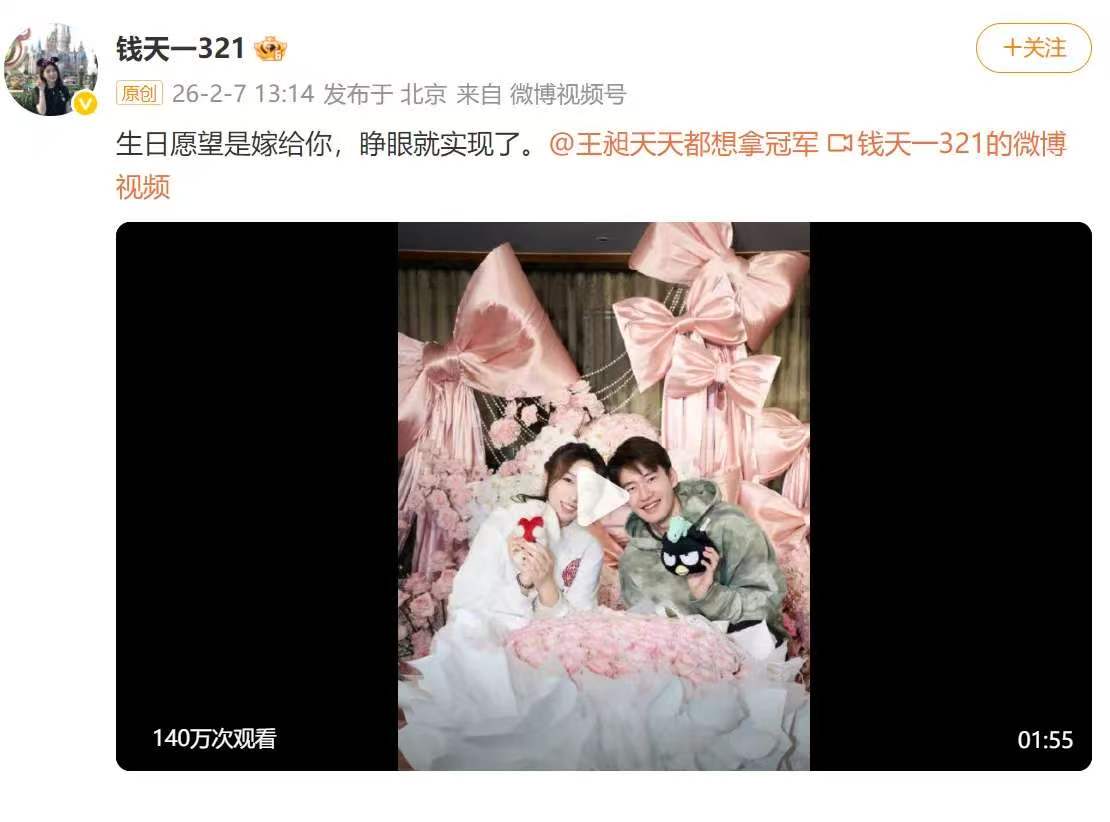 “#王昶钱天一结婚#”话题迅速登上热搜榜首。网友将这对新人的结合形容为“乒羽一家亲”,是“国家队梦幻联动”。