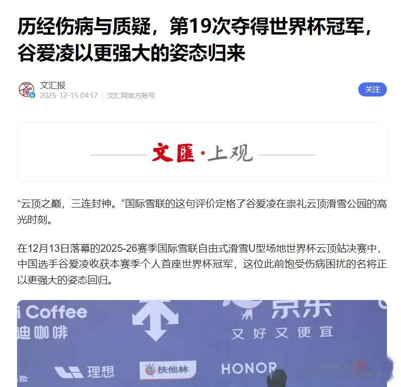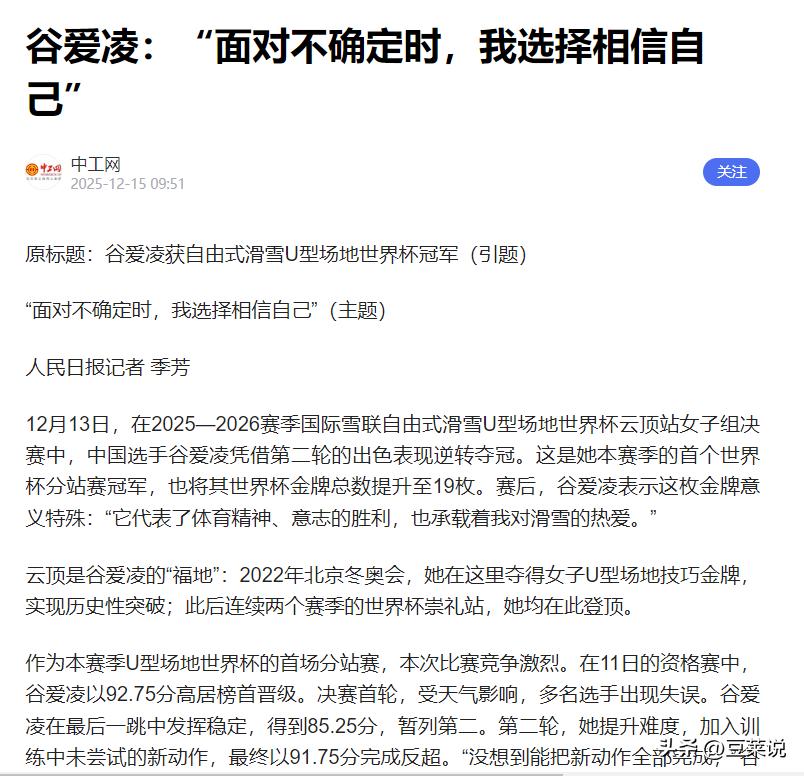 信息来源:历经伤病与质疑,第19次夺得世界杯冠军,谷爱凌以更强大的姿态归来