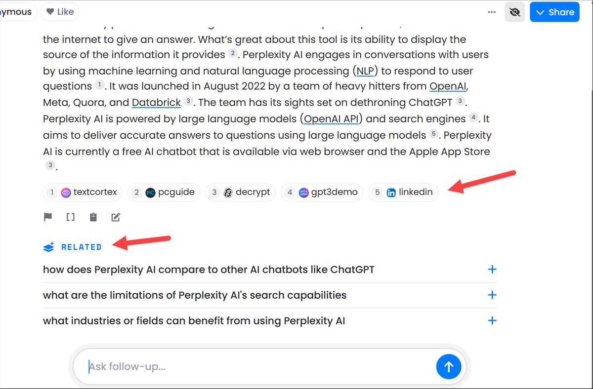 Perplexity还有另一个显著特点,它支持连续追问,有点像“AI问答社区”。Perplexity 创始团队有来自美版知乎Quora的成员,使用Perplexity时你可以一问再问,它会“记住你前一个问题”,在上下文里逐步深入。不像传统搜索,每次都是“一问一搜”,用户得自己整合答案。
