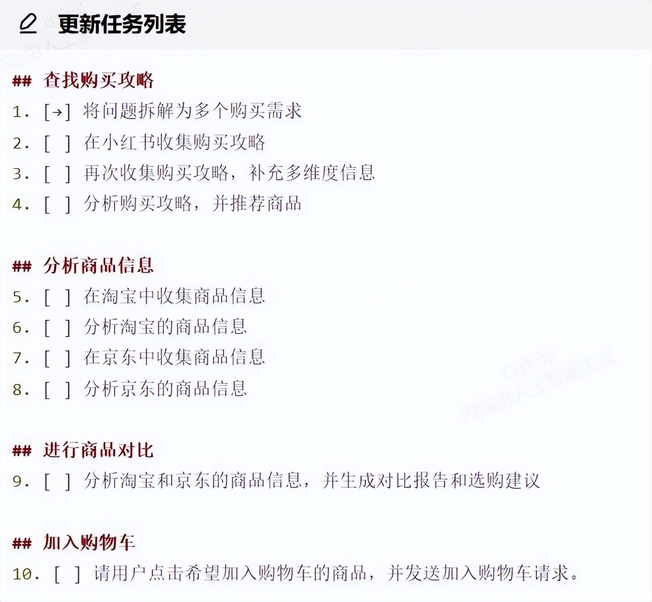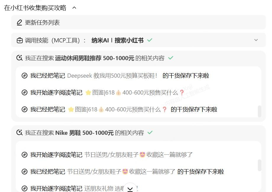 每个子任务单独进行信息搜索和MCP工具调用,比如在小红书收集各个品牌的购买攻略。