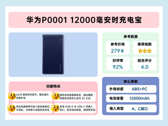 华为P0001容量12000mAh,额定6600mAh,支持66W超级快充,通过德国莱茵安全快充认证和3C认证,安全性可靠。电芯为钴酸锂聚合物,性能优于常规三元锂。支持小电流模式,双击电源可为耳机、手表等小设备充电,操作简单。USB-A和USB-C接口均可输入,快充状态下约1.8小时自充完成。四颗LED灯显示剩余电量,每颗对应25%电量,查看直观清晰。容量中等,价格约279元,相比同容量略高,但快充和品牌体验稳定可靠。