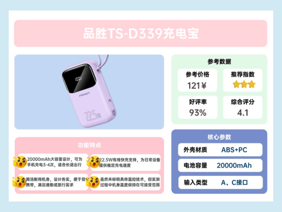 品胜TS-D339容量为20000mAh,按日常使用,一部手机可以充3到4次,长途出行或长时间外出时续航足够。机身设计偏实用风格,手持略有重量,但放入背包携带方便。充电功率为22.5W,虽然不是最快,但比普通充电宝仍明显快。实际使用中,机身充电时温度适中,没有明显发热问题。自带线设计省去携带额外数据线的麻烦,使用简单,接口布局清晰。对追求基础可靠的用户而言,这款充电宝表现稳健,耐用性不错,无额外复杂功能,使用上基本不会出意外。