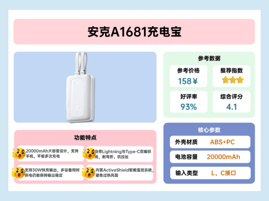 安克A1681容量20000mAh,可支撑出差2-3天的多设备使用。自带Lightning和Type-C两根线材,坚韧耐用,外出无需额外携带充电线。30W有线输出稳定,多接口设计可同时充多个设备,效率较高。机身紧凑,重量约362克,手持稍有压力,但放入旅行包占用空间不大。ActiveShield智能温控芯片在多设备充电时温度控制较好,保持在40℃以下,使用安全感尚可。实际体验中,自带线使用便利,出差或高铁旅行时能快速给手机、平板充电,不必翻找额外线材,比较方便。