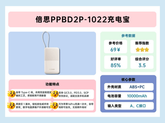 倍思PPBD2P-1022自带Type-C线,采用高密度双层编织工艺,比普通PVC线更耐用,延长使用寿命。支持USB-C、USB-A输入及自带Type-C线输入,并兼容QC3.0、PD3.0、SCP等快充协议,市面主流手机都能充。机身厚度约1厘米多,便于携带,抛光UV镜面数字显示在强光下依然清晰。实际测试,给苹果16Pro充电可充满一次,第二次约充70%,30分钟可充至55%,速度满足日常需求。外出使用时,携带自带线即可,无需额外线材,轻便便利。