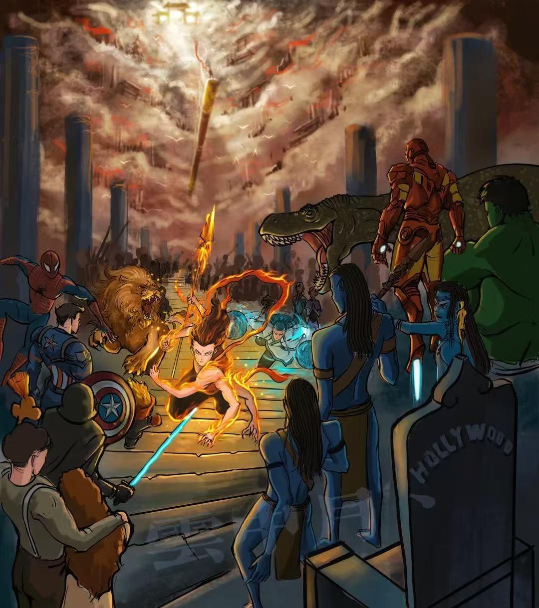 画作中哪吒手持金箍棒直面阿凡达的场景,可以解读为中国电影与好莱坞电影的直接竞争,不再是追随者,而是挑战者,甚至是改变者,重塑着全球电影市场的格局和规则。