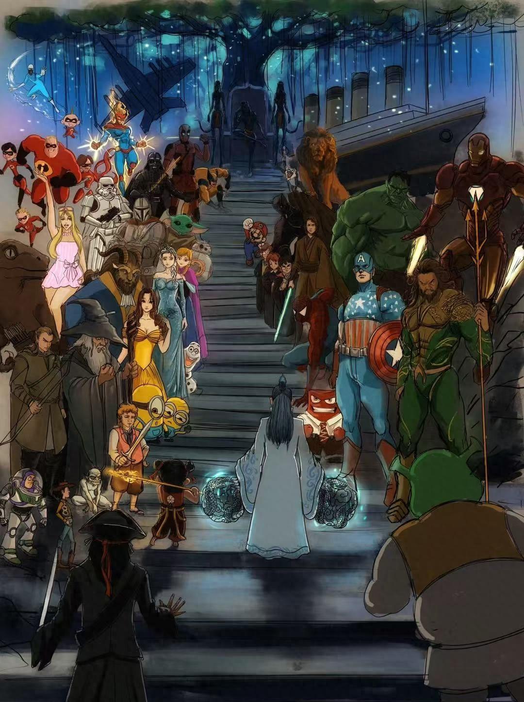最初的那张画里,哪吒小小的身影和敖丙并肩站在台阶下方,面对着许多西方电影角色的注视,那种感觉就像是刚刚进入一个陌生的班级,而班级里的同学都在打量你。那时的阿凡达还坐在最高处,姿态放松得像个不可撼动的霸主,他的眼神里写满的傲慢。画面构图非常有意思,把西方电影角色放在高处,形成一种无形的压迫感,让哪吒和敖丙看起来像闯入者。