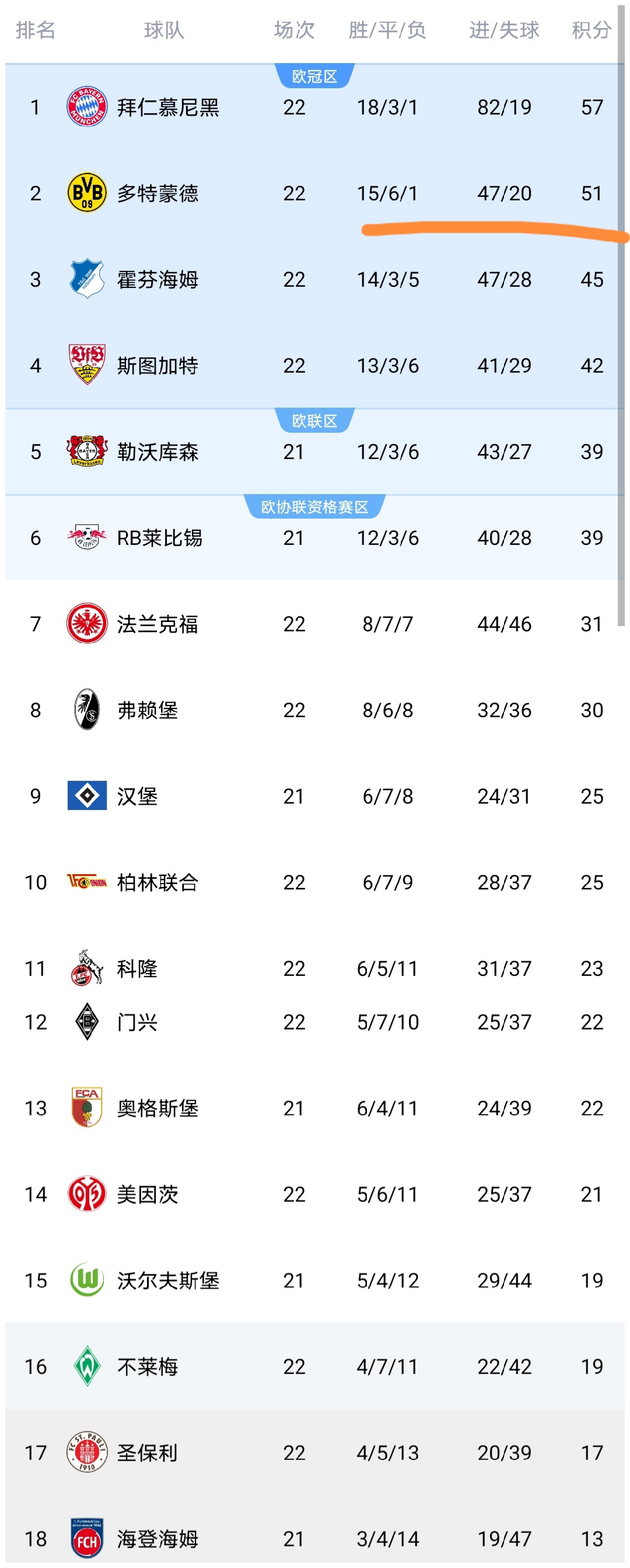 昨晚至今天凌晨,德甲第22轮结束了6场较量,拜仁、勒沃库森、霍芬海姆等队出战,这6场较量之后,德甲积分榜发生变化,我们来看看。