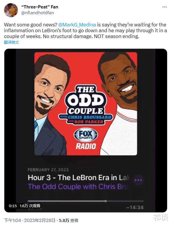 关于詹姆斯的伤病消息,球队方面没有放出任何消息,而NBA官网记者Mark Medina在节目中接受采访时对此表示乐观:“我被告知,勒布朗肯定要缺席一两周。谢天谢地,医生不认为这是需要他做手术的伤病。他只是需要一些时间来休养,消除足部炎症。存在一种可能性,他不仅会在本赛季回归。”