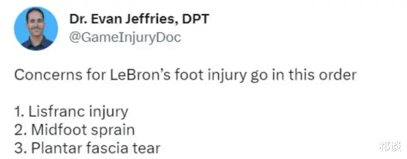 近日,湖人在客场对阵独行侠的赛后,宣布了主将詹姆斯因伤将缺席一段时间的比赛,不过关于詹姆斯的具体伤情并未公布,不少媒体对此开始推测。运动专家Jeffries也对詹姆斯的伤情进行了评估,他发推列举出了三种可能性:一是跗跖关节受伤,二是中足扭伤,三是足底筋膜损伤。