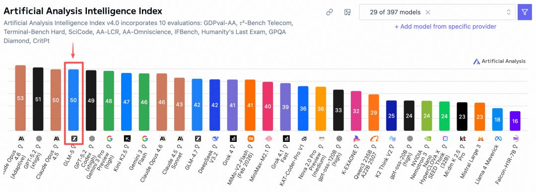 在全球权威Artificial Analysis榜单中,GLM-5位居全球第四、开源模型第一,是当前开源大模型中编程与智能体能力的最强选手。