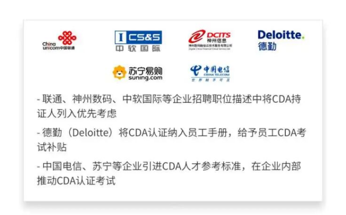 CDA企业认可度非常高,很多企业招聘时注明CDA数据分析师优先,对找工作非常有帮助。很多银行、金融机构的技术岗会要求必须是CDA数据分析师二级以上的持证人。中国联通、央视广信、德勤、苏宁等企业,把CDA持证人列入优先考虑或者对员工的CDA考试给补贴。