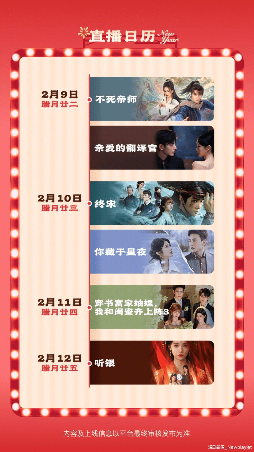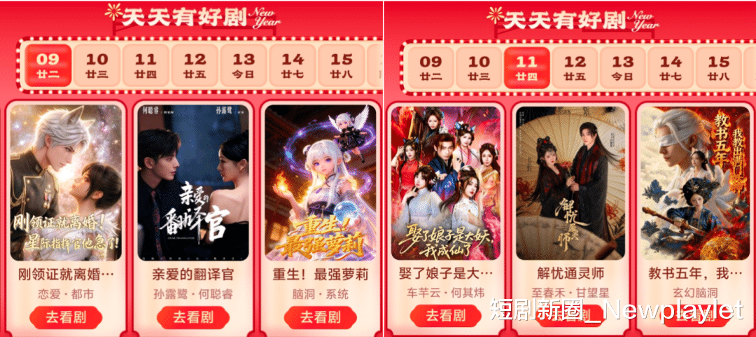 红果观剧日历是观众解锁这份观剧大餐的实用工具。日历覆盖了从腊月廿二到正月十一的核心观剧时段,同步标注了24部片单的上线时间、对应农历日期及核心看点,每日都有优质新剧上线,满足观众春节假期的持续观剧需求。观众在红果短剧 APP 内即可查看,提前点击预约,以便剧集上线第一时间解锁全集观看,彻底告别错过更新的遗憾。
