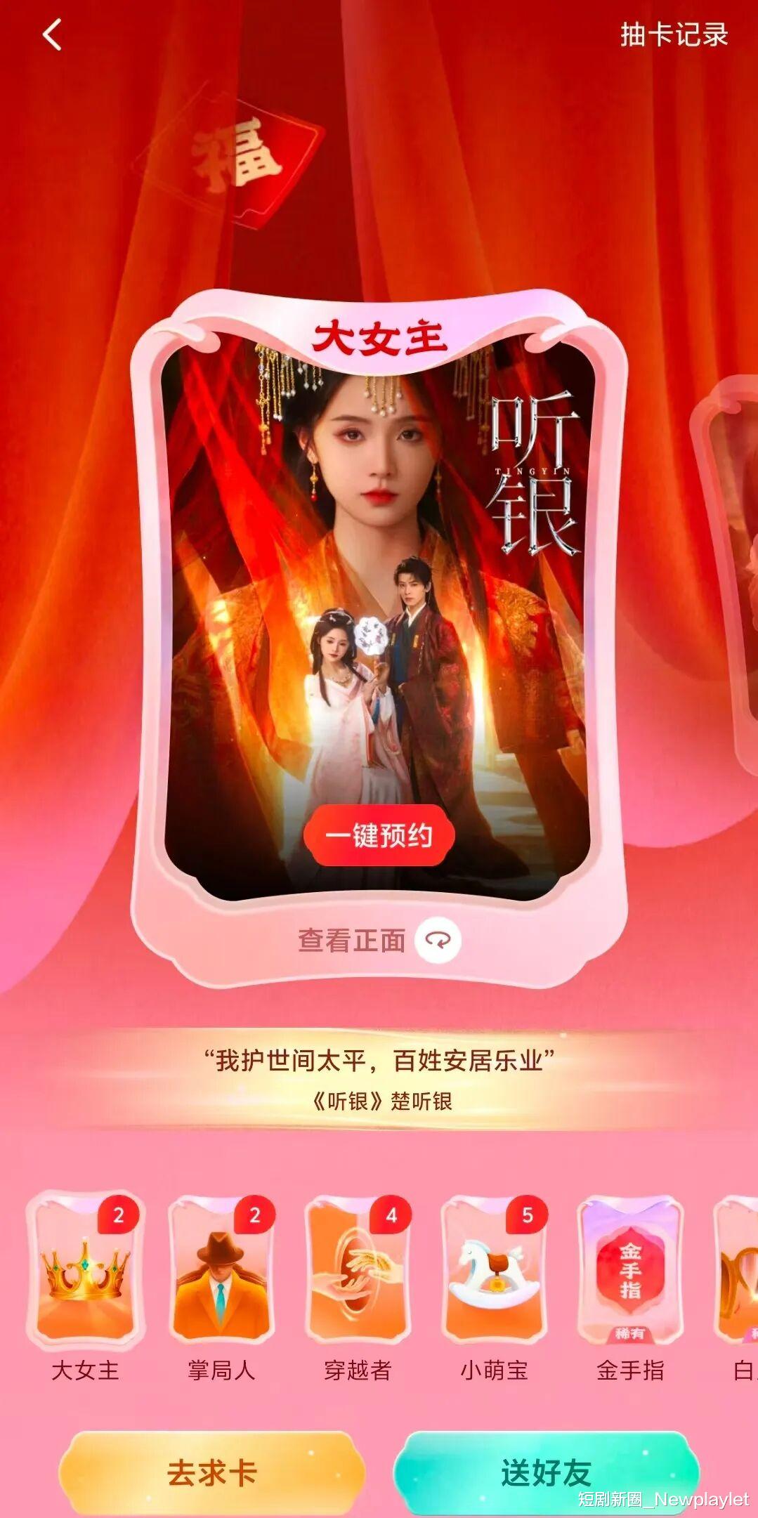 值得一提的是,本次集卡活动还分为“角色卡”与“剧情卡”两个阶段,每集齐一套卡面即可实现奖金金额翻倍,卡牌反转之后,背面还能开出剧集盲盒,边玩边解锁新剧,让春节假期彻底告别 “剧荒”。比如,大女主卡背面是《听音》;掌局人的背面是《天下第一纨绔》;白月光的背面是《玫瑰藏于盛夏》……