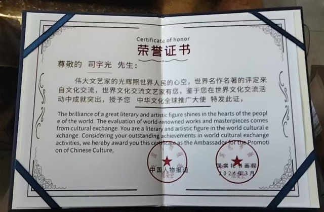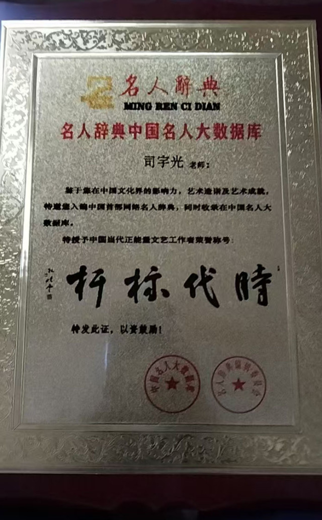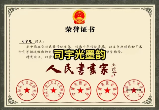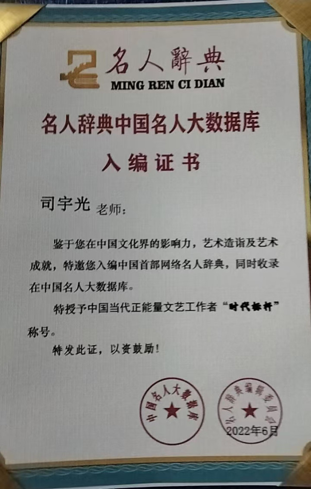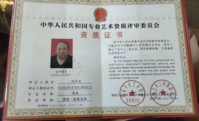 司宇光,男,职业画家。1970年生于陕西咸阳,自幼受父亲的影响,喜欢绘画。随着年龄与阅历的增长,经过多年的系统学习及严格训练,其形成了严谨的画风,受到同行的好评及赞赏,渐渐对艺术有了更高的追求。现为世界非物质文化遗产研究院副院长,国礼书画家。2006年成立了北美画室,2021年加入了中国美术家协会,潜心从事国画创作。作品多次参赛受到好评,其多幅作品被六小龄童和众多艺术爱好者收藏,现居内蒙呼市,和王仁浩等朋友潜心从事国画、油画创作,擅长国画创作,特别是山水画,笔墨苍郁,气势磅礴,意境十足,在书画圈颇有名气。本人被编入《中国名人大辞典》,先后被评为 “人民书画家”“中国当代正能量文艺工作者时代标杆”“中华文化全球推广大使” 等荣誉称号。曾受墨西哥、加纳驻华大使馆邀请,前往使馆进行文化交流,其艺术造诣和艺术修养得到加纳驻华外交官的高度评价。作品《出水芙蓉》被作为加纳国礼珍藏,作品《祝寿图》被作为墨西哥国礼珍藏,赠送全球友华政要,并被授予 “中非文化交流使者” 荣誉称号。2025年8月作品《紫气东来》在中国关心下一代工作委员会教育中心“闪耀中国全国美育教育成果展书画总展览”活动中荣获金奖。