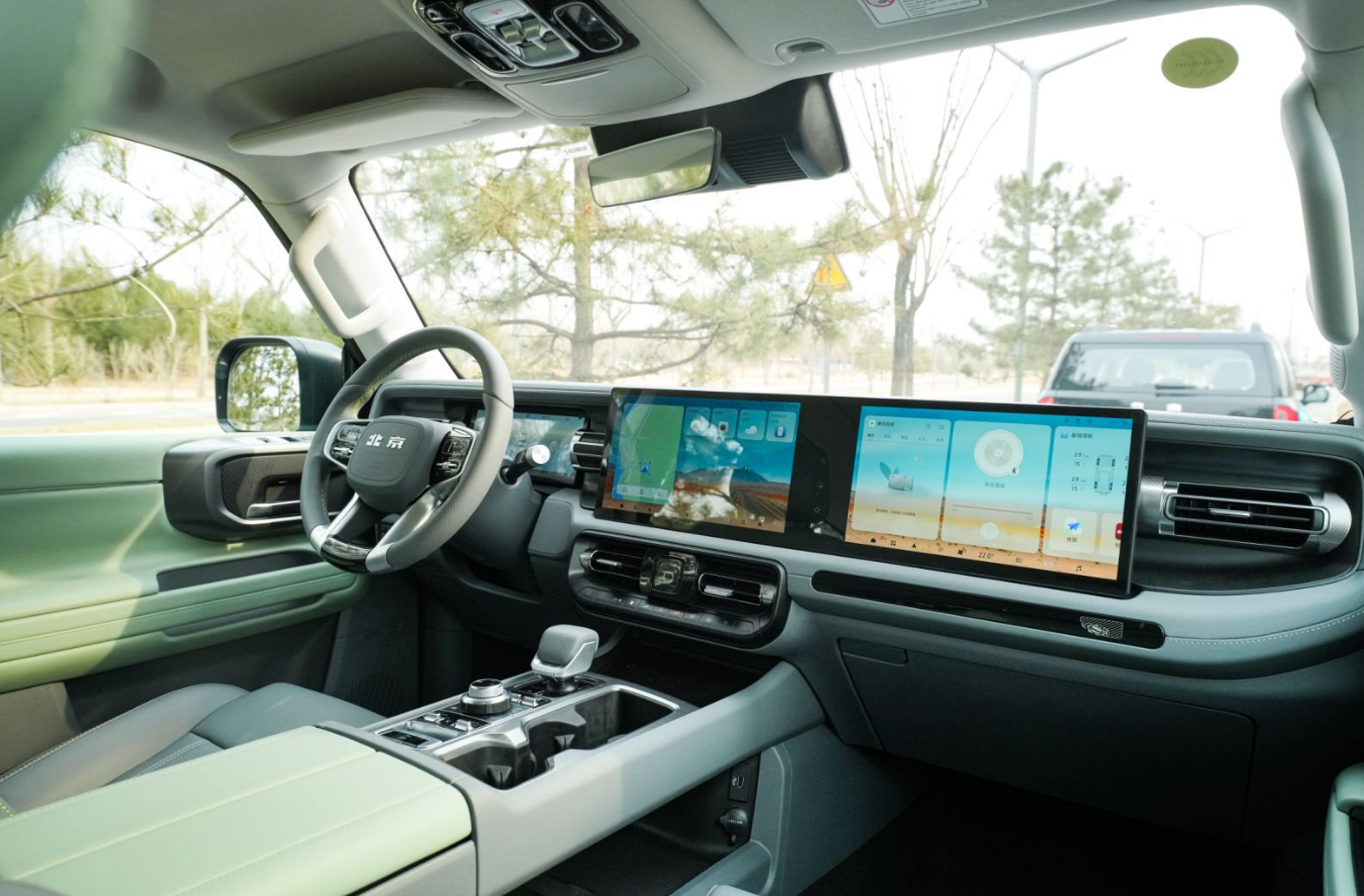 坐进车内,科技氛围与便利设计直接影响着心情。BJ40燃油创新性地采用了双12.8英寸悬浮式联屏,不仅观感现代,副驾驶屏也为旅途增添了娱乐选择。通过高坐姿与低水切线的设计,它带来了类似“指挥官”般的开阔前方视野,有助于缓解城市驾驶的视觉疲劳。坦克300搭配14.6英寸悬浮式中控屏,无副驾娱乐屏。