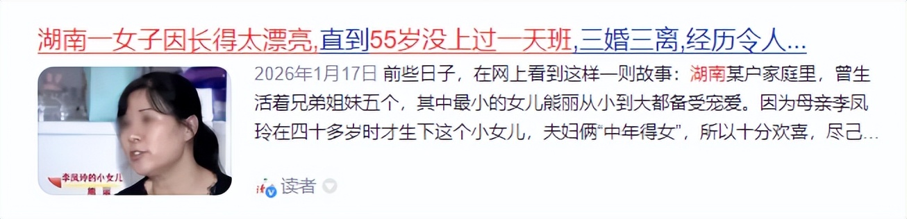 湖南女子熊丽因被外界贴上“太漂亮”的标签,整整55年未曾踏入职场半步。