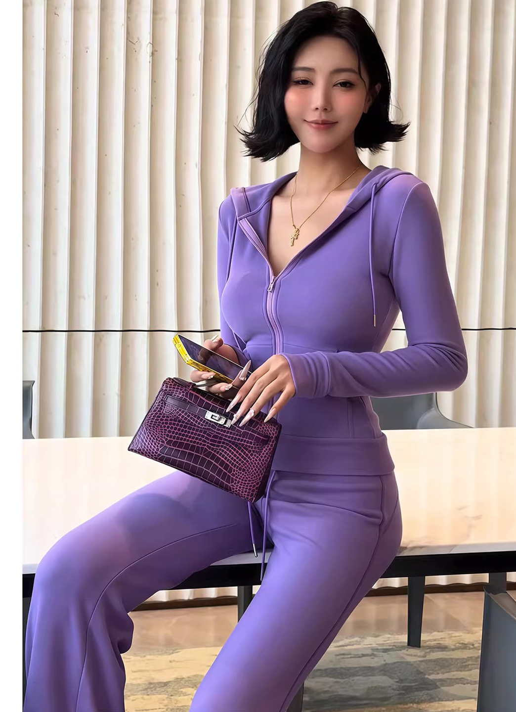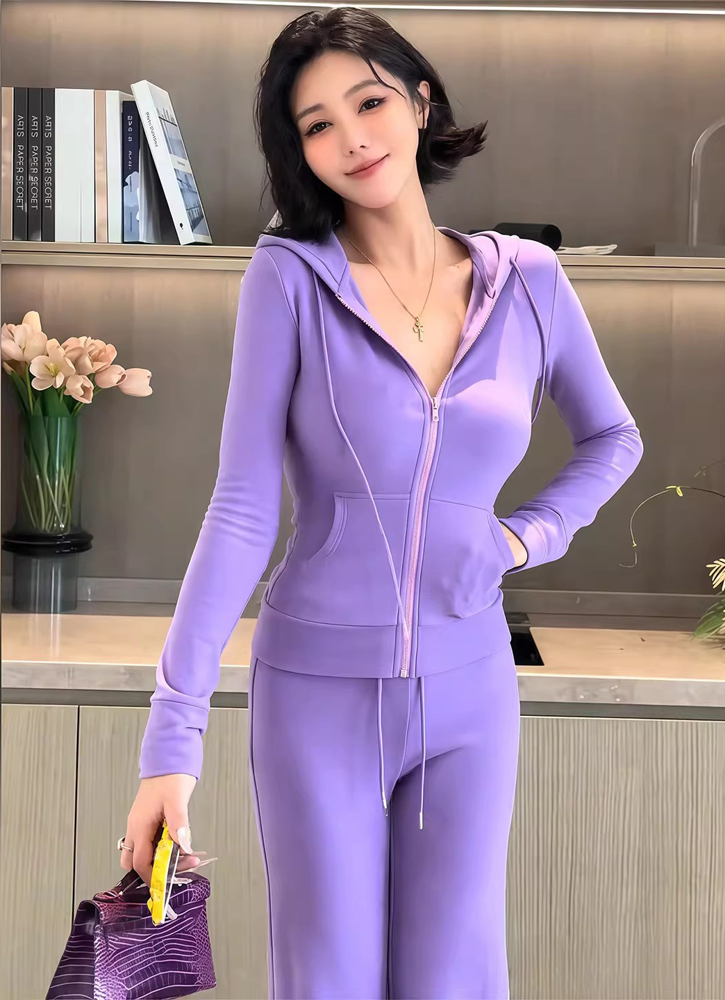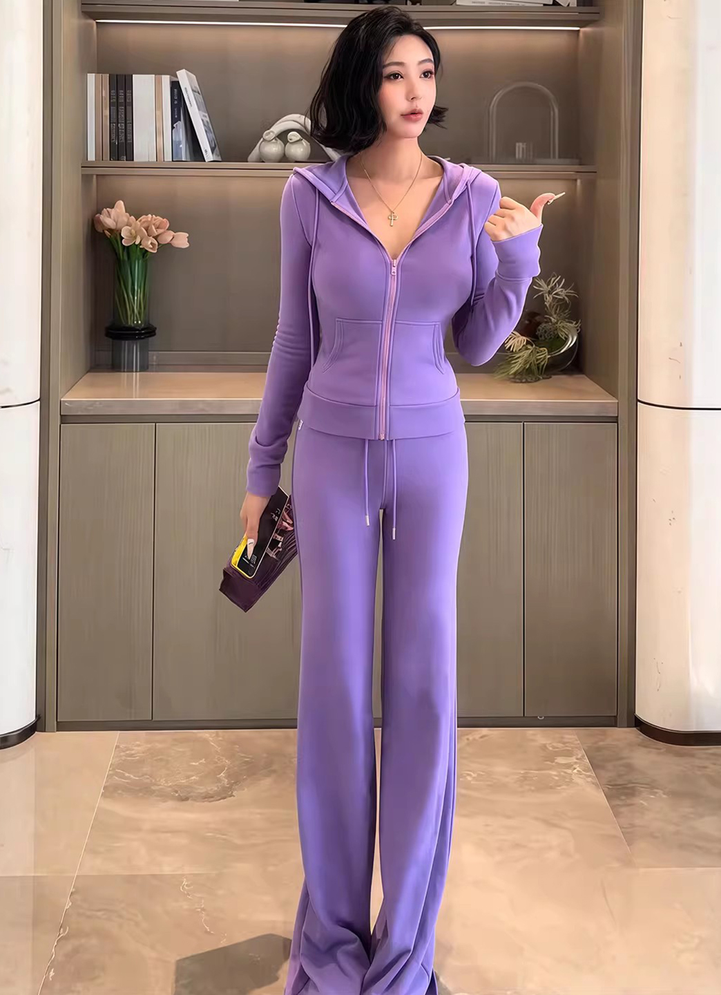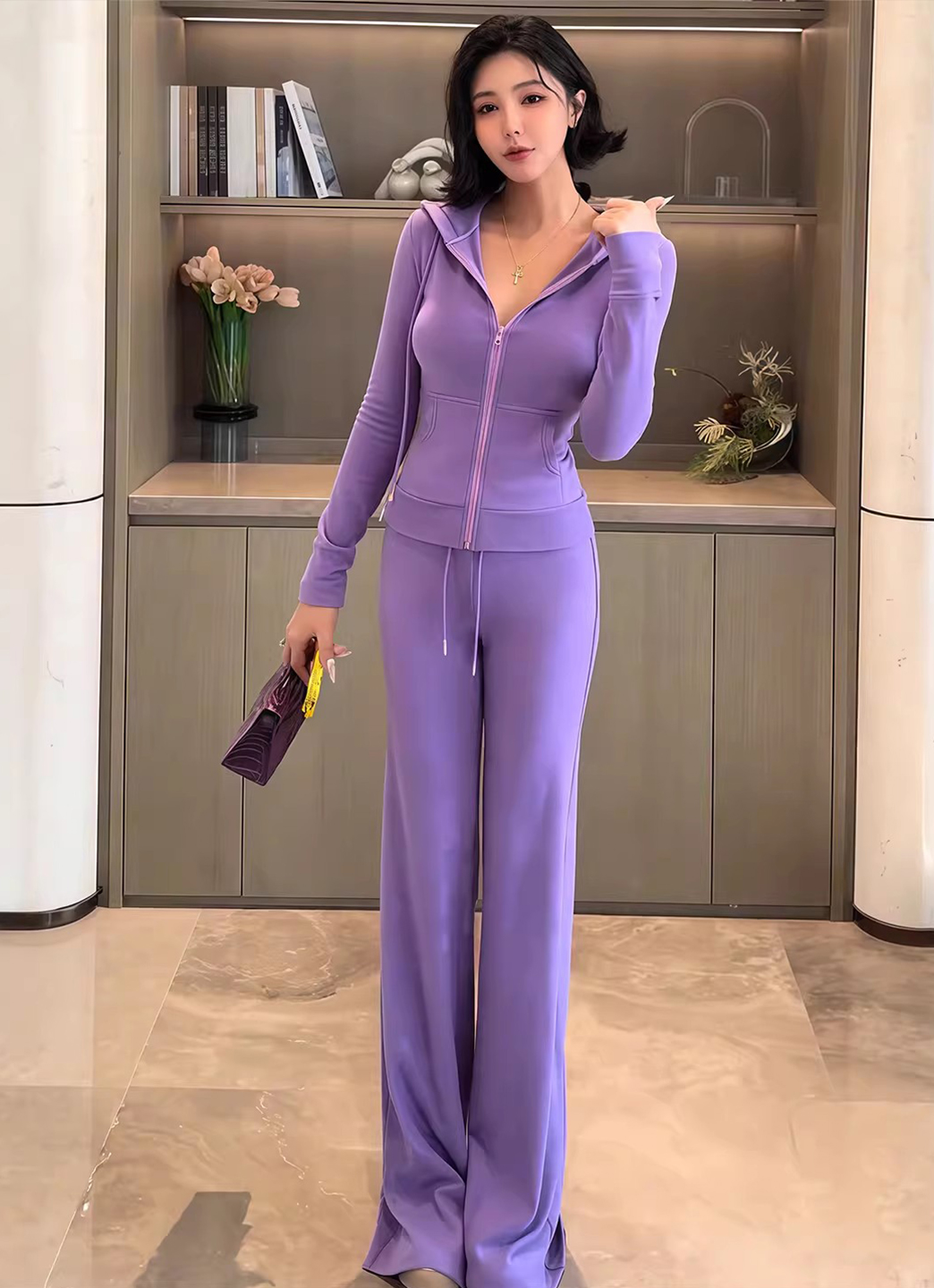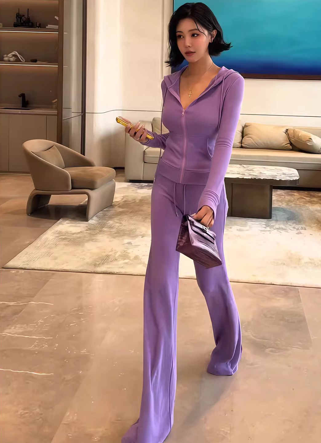 紫色连帽拉链卫衣搭配同色系阔腿裤,简约时尚,展现休闲慵懒风。整体色调柔和,修身剪裁凸显身材,适合日常通勤或居家穿搭。