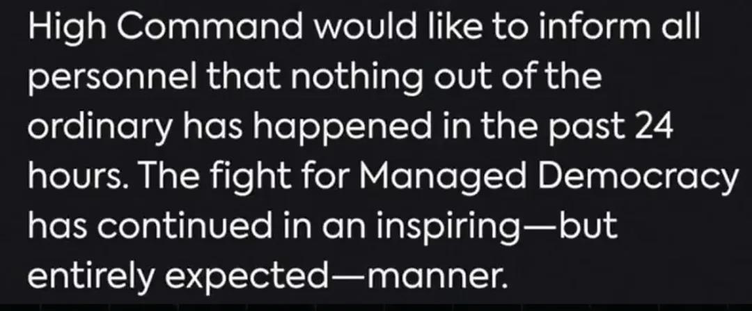 指挥部特此通知所有人员:过去24小时内未发生任何异常情况。争取管理式民主的战斗,正以一种鼓舞人心且完全符合预期的方式进行。如果您认为发生了什么怪事,您很可能受到了敌方精神控制,请立即接受审查。