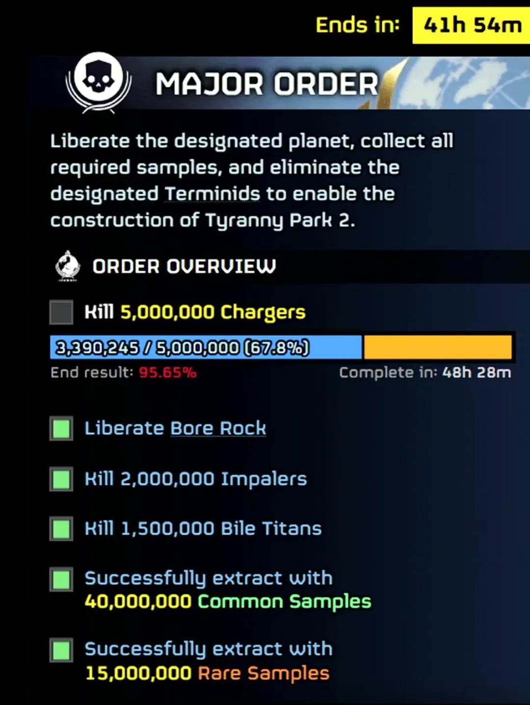 上图就是一条重要指令,也是目前游戏中正在执行的指令。这是我昨天截的图。我们告诉玩家,由于“暴政公园一号”不幸地、且无法预见地被摧毁了,所以他们必须帮助超级地球建造“暴政公园二号”。为此,他们需要解放某些星球,消灭各种类型的敌人,以及收集一些样本。