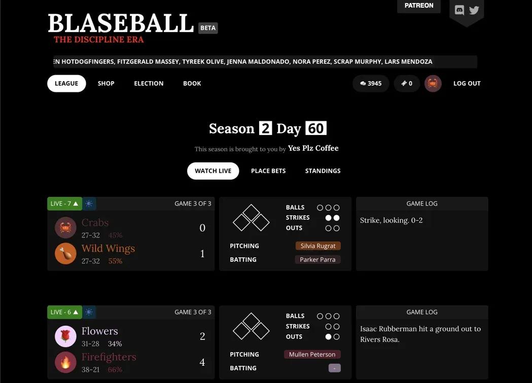我试着找过其他有类似做法的游戏(虽然没找到几个)。其中一款叫《Blaseball》的游戏。不知道有没有人玩过?疫情期间很火。那是个网页游戏,你扮演一个恐怖荒诞的棒球队经理。他们做的事情,跟我们在《绝地潜兵2》里做的非常相似:玩家为自己的球队编造故事和比赛情节;开发者则不断注入新的内容,比如各种疯狂的NPC。