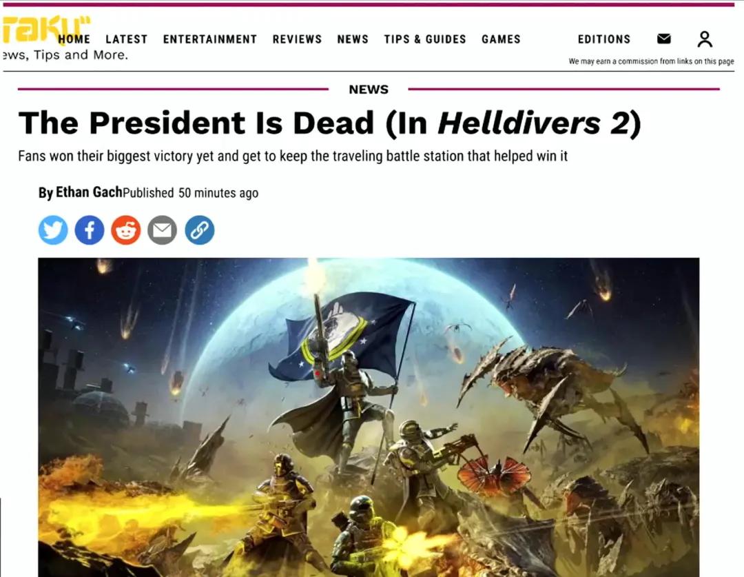 我们根本没料到会这样。于是,我们再次祭出了“免罪金牌”。在超级地球即将陷落之际,我们在游戏里发布了一则简报:“总统在他坚守的掩体中英勇牺牲。”