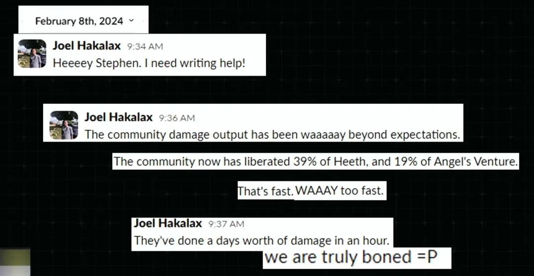 2月8日,游戏发售日,一个激动人心的日子。我收到了Joel的消息:“嘿,Stephen,我需要文案支援!社区的伤害输出远远超出了预期。他们已经解放了‘希斯’行星39%的区域和‘天使投资’行星19%的区域!这太快了,快得离谱!他们只用了一个小时,就打出了原本计划一天的伤害量。我们真的完蛋了!”