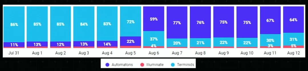 这是从八月初开始的数据。你可以看到,在左边,浅蓝色部分,头5天左右,超过80%的玩家都在打终结族;5天后,出现了一个巨大的转变,超过70%的玩家开始去打机器人了。原因很简单:我们的重要指令从“终结者主题”切换到了“机器人主题”。