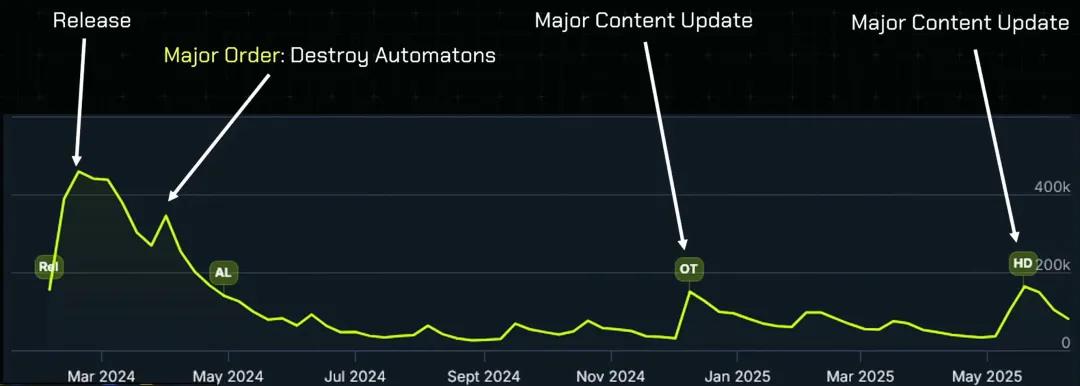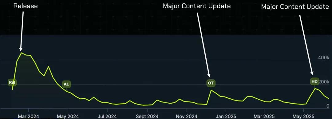 这是游戏上线至今的Steam同时在线玩家数。你能看到几个峰值。最大那个是发售时的,还有两个是大型内容更新。这对于一个在线服务型游戏来说,是符合预期的。当你发布了大量新内容,玩家们自然会很兴奋地回来看看有什么新东西。