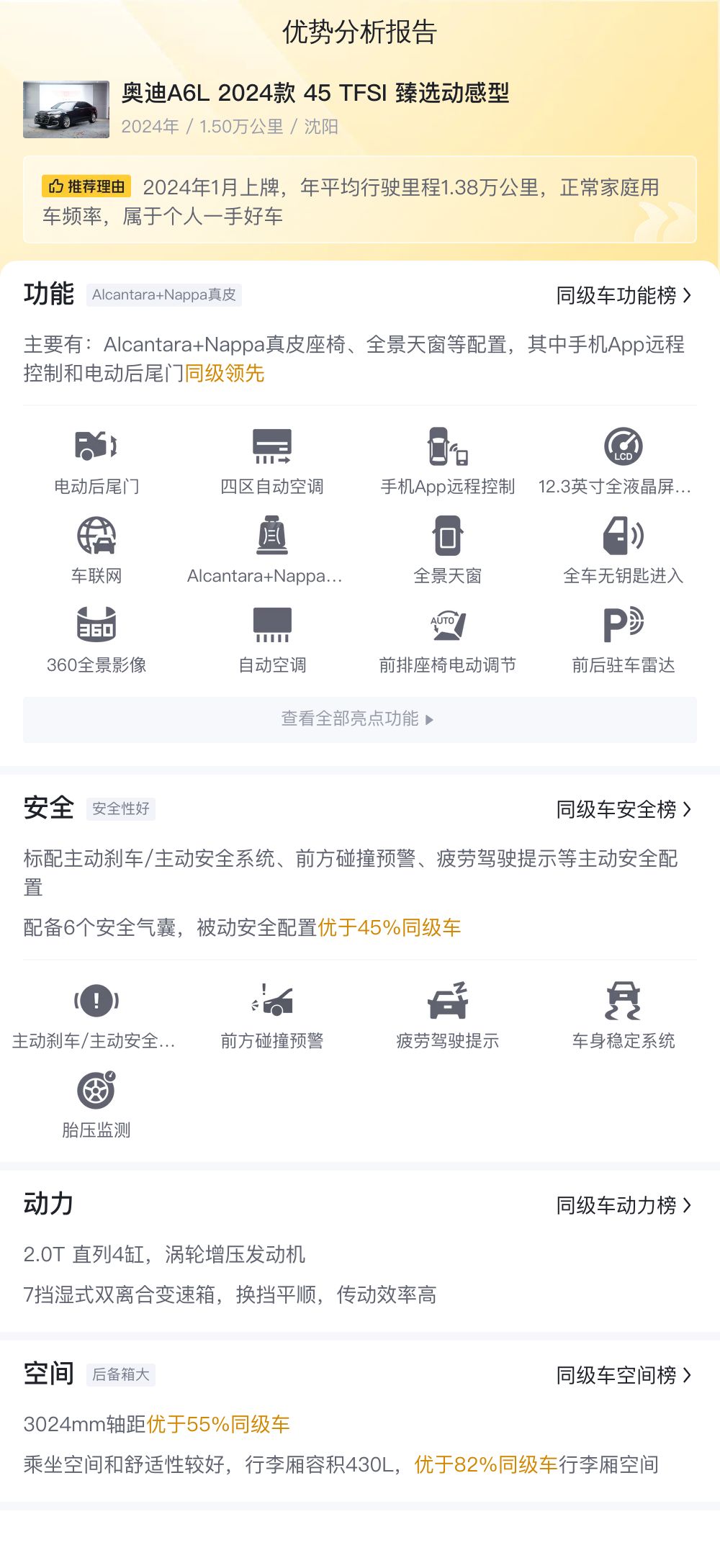 综上所述,奥迪A6L 2024款 45 TFSI 臻选动感型在配置、动力、空间等方面表现出色,且售价合理,保值率高,是一款性价比较高的车型。但其养车成本相对较高,且存在一定的二手贬值风险。建议您在购买前充分考虑自身需求和经济实力,谨慎选择。如果您注重豪华品牌、追求驾驶体验且经济条件允许,那么这款车绝对是一个不错的选择。