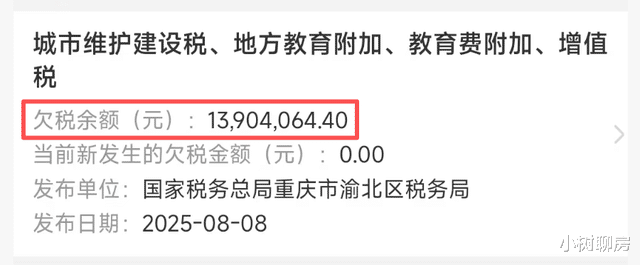 更值得注意的是,渝北区税务局在2025年8月发布了一条公告,开发商拖欠各种税款达1390万元之多。