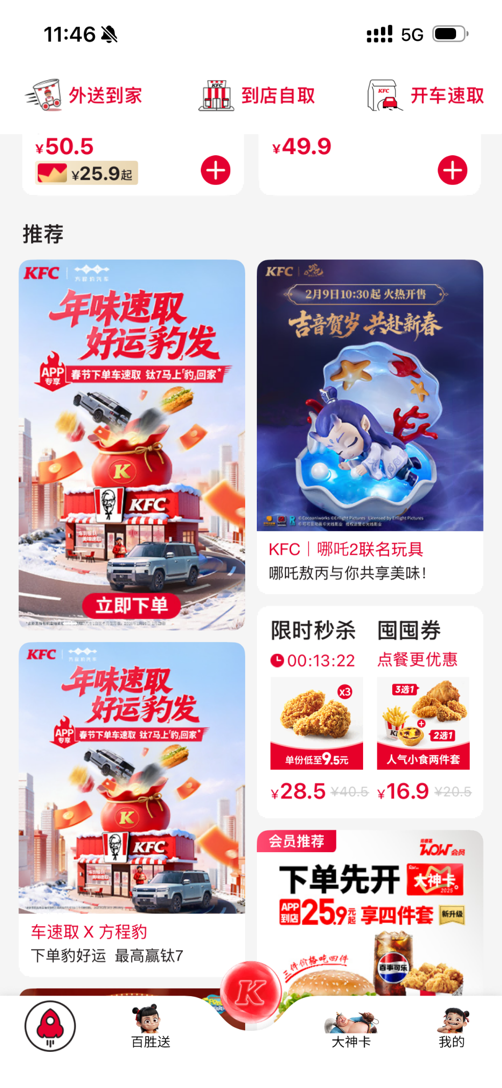 宝子们!方程豹新年趣味出圈,和肯德基马年联名送福利咯~2.10-2.23上肯德基APP用车速取下单,就能免费抽奖啦!大奖居然是方程豹钛7汽车3个月使用权,还有超萌的豹豹公仔、精致车模这些可爱周边,真的太心动啦